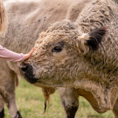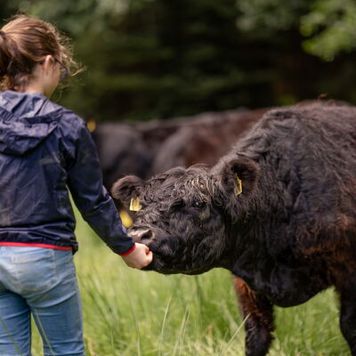Besonders Deine Kinder sind bei uns herzlich willkommen und können sich auf eine ganze Menagerie von Tieren freuen: Tolle Reitpferde, liebe Ponys, die Mini-Shetty Stute Foxy, die lieben Hofhunde Bruno und Rudi, Kaninchen, Hühner, die Kater Fritzi und Milo sowie unsere Galloway Mutterkuhherde mit unserem White Galloway Zuchtbullen Bruno auf unseren Weiden.