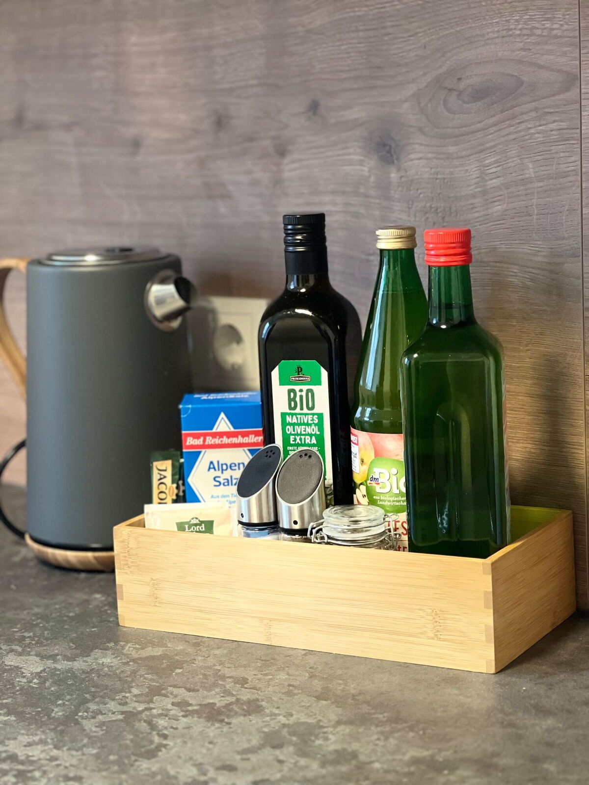 Küche: Voll ausgestattet mit Geschirrspüler, Backofen, Mikrowelle, Toaster, Kaffeemaschine, Wasserkocher, Kühlschrank mit Gefrierfach und Grundzutaten (Salz, Pfeffer, Öl, Essig).