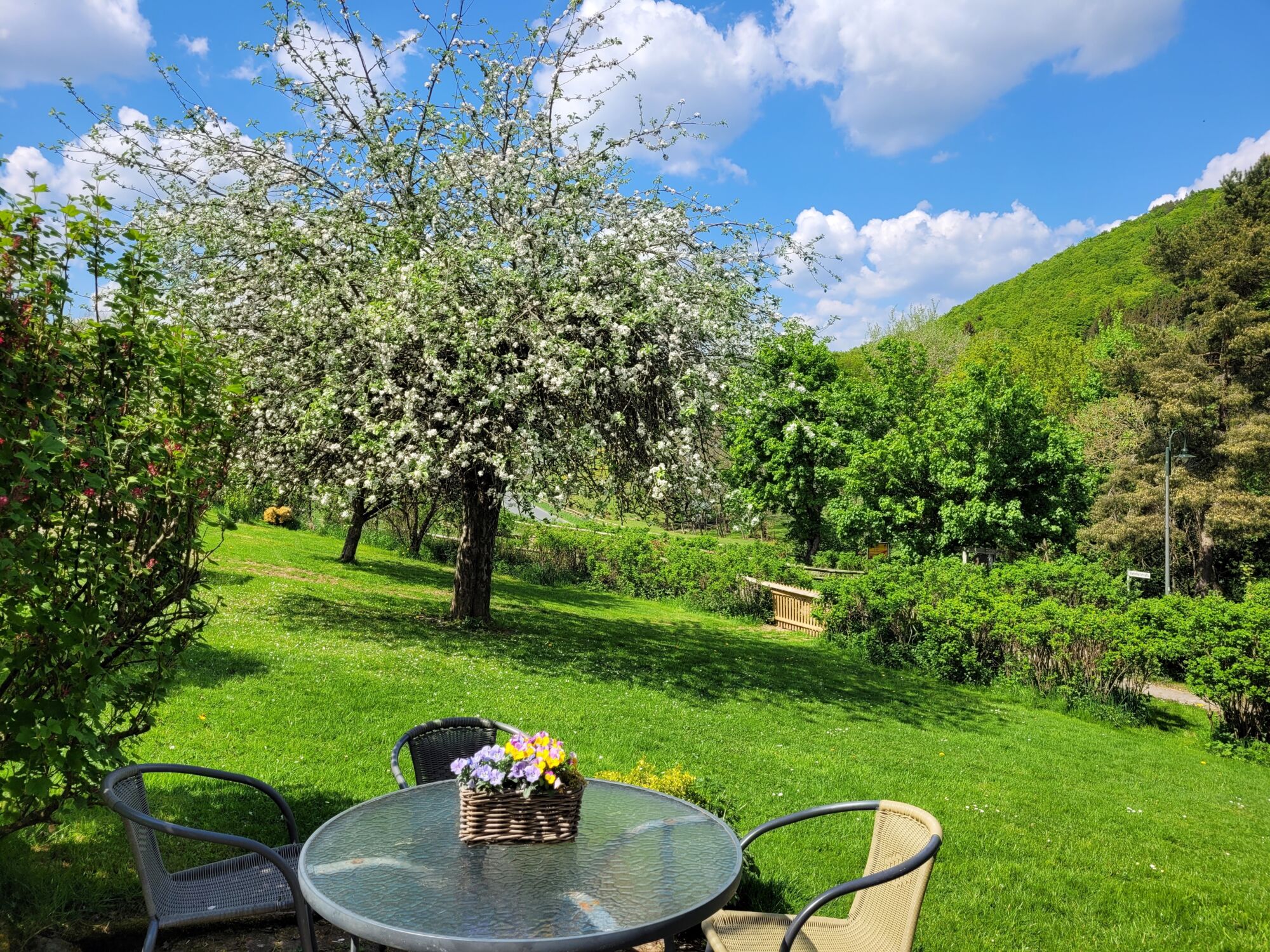 Gemütlich und stilvoll eingerichtet, bietet Dir die Ferienwohnung Wildrose einen wunderschönen Blick in den Obstgarten und auf das Wiesental mit Pferdekoppeln. Eine Terrasse mit Gartenmöbeln und der Obstgarten laden zum Entspannen ein.