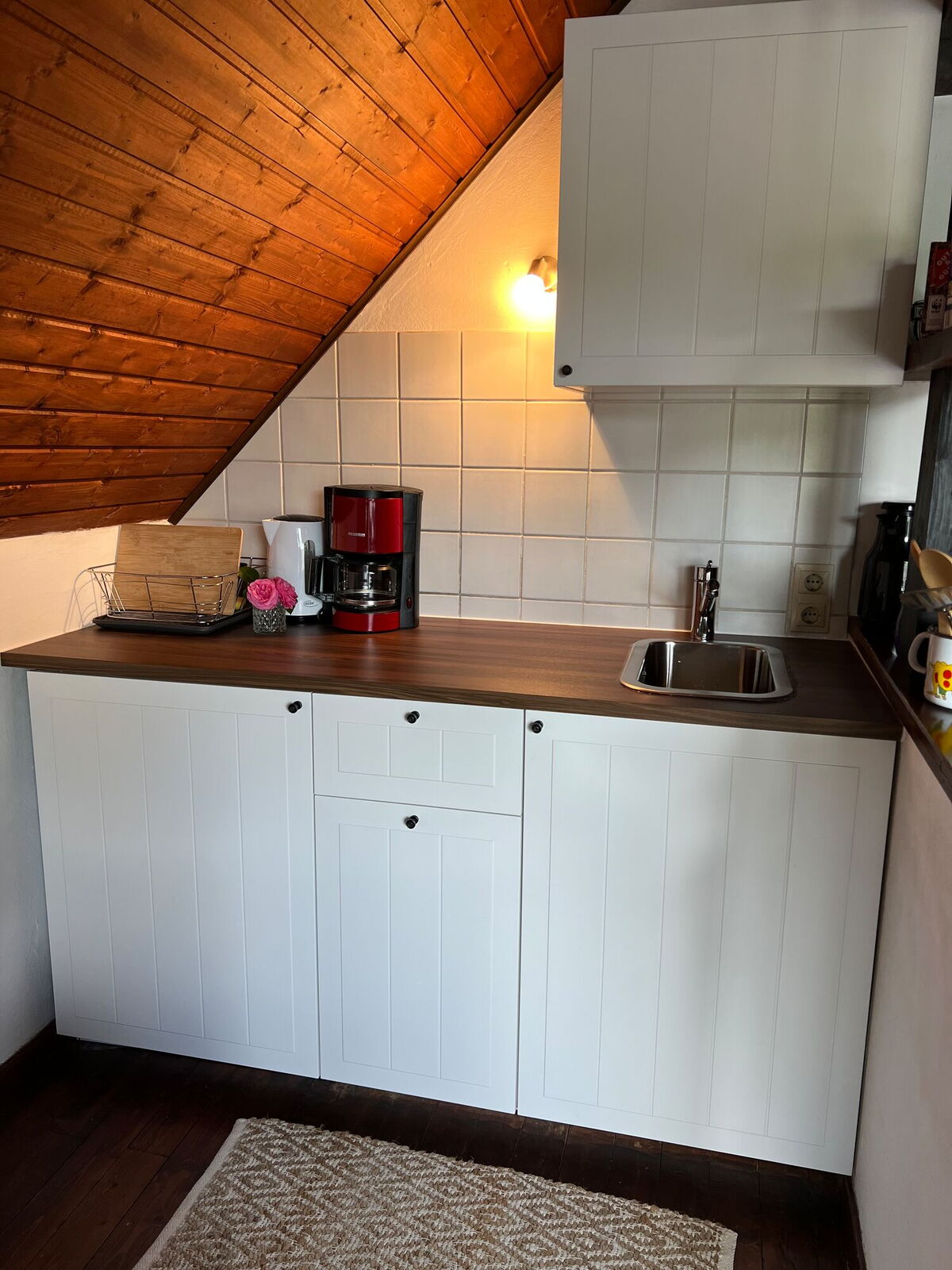 Die Küchenecke ist gut ausgestattet mit einem mobilen Induktionskochfeld, Kühlschrank mit Gefrierfach, Kaffeemaschine,Toaster und vieles mehr.